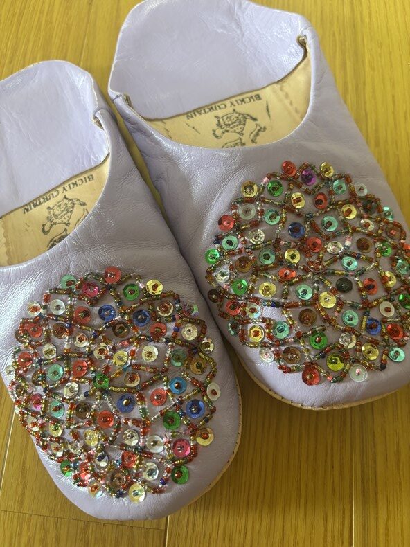 <ミックスビーズ ラベンダー>のバブーシュも、スパンコールの可愛らしさを楽しんでいただき、
