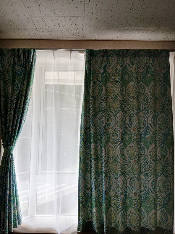 昼間の太陽光と夜の室内証明との色味の違いも楽しんでいます。部屋に来る友人たちにも、キレイなカーテンだねとよかったです。