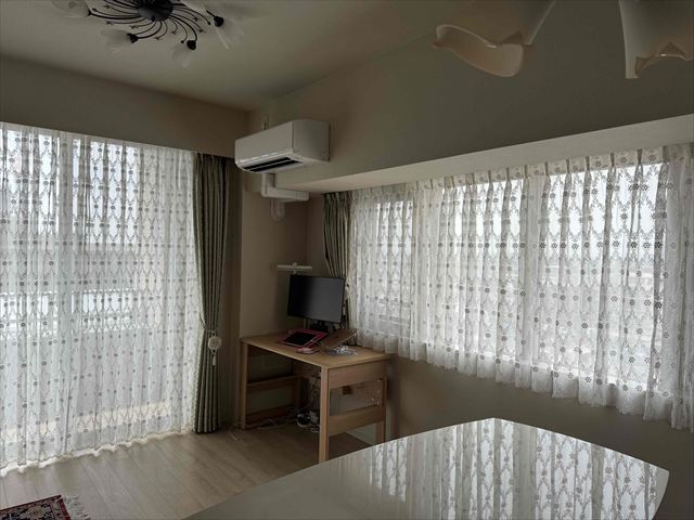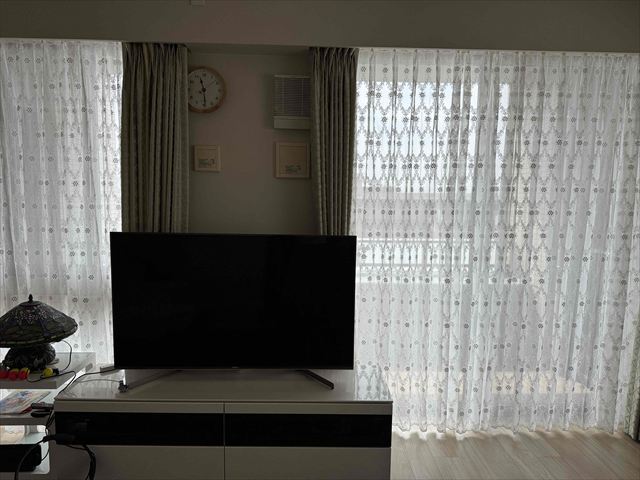 ワイドの大きいお窓に2枚ひだのトルコ刺繍レースカーテンが素敵過ぎて、圧巻です!!