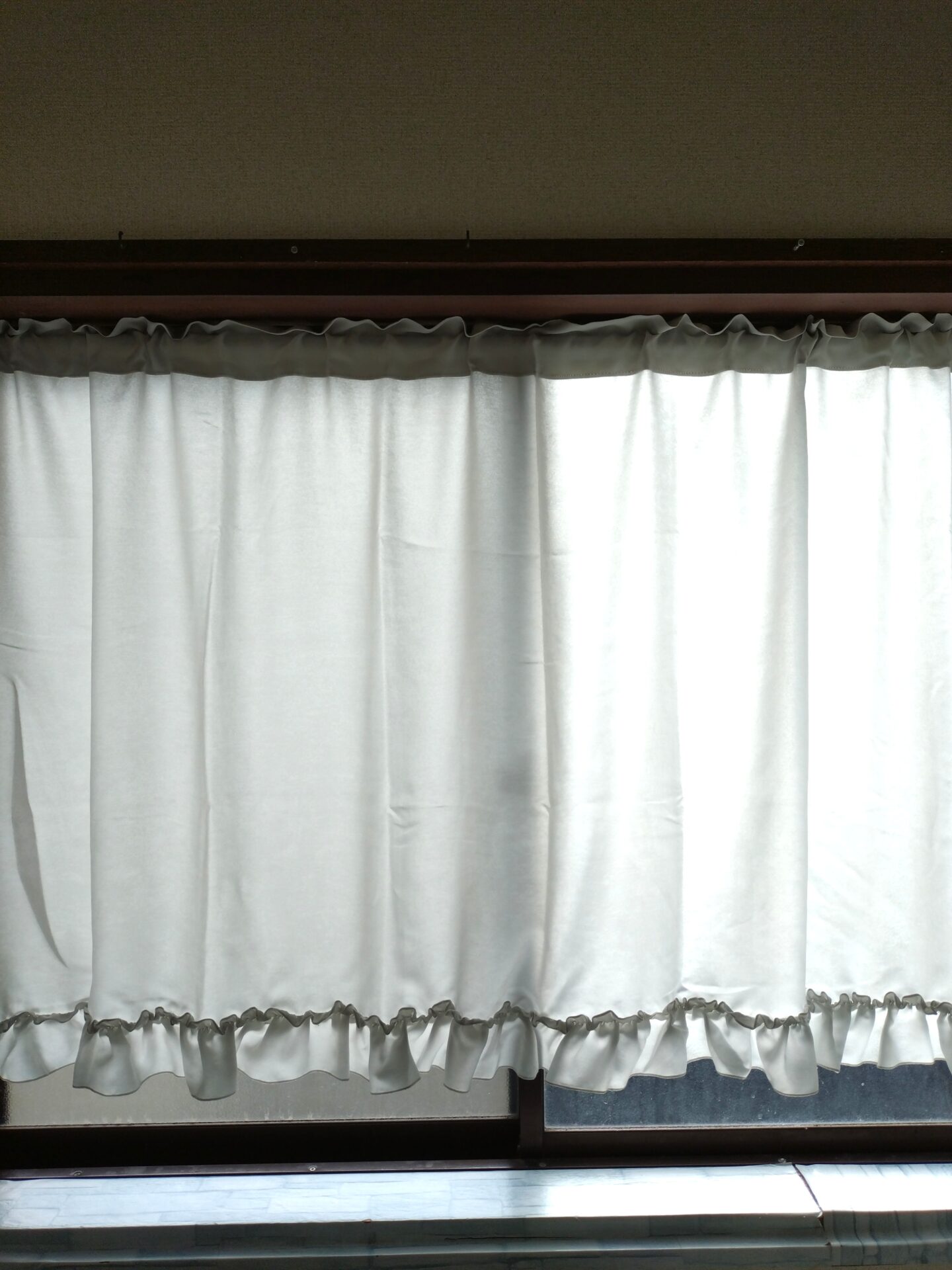 ご購入いただきました<レース カフェシルキー シルバーブルー>はフリル付きのカフェカーテンをお選びいただきました。