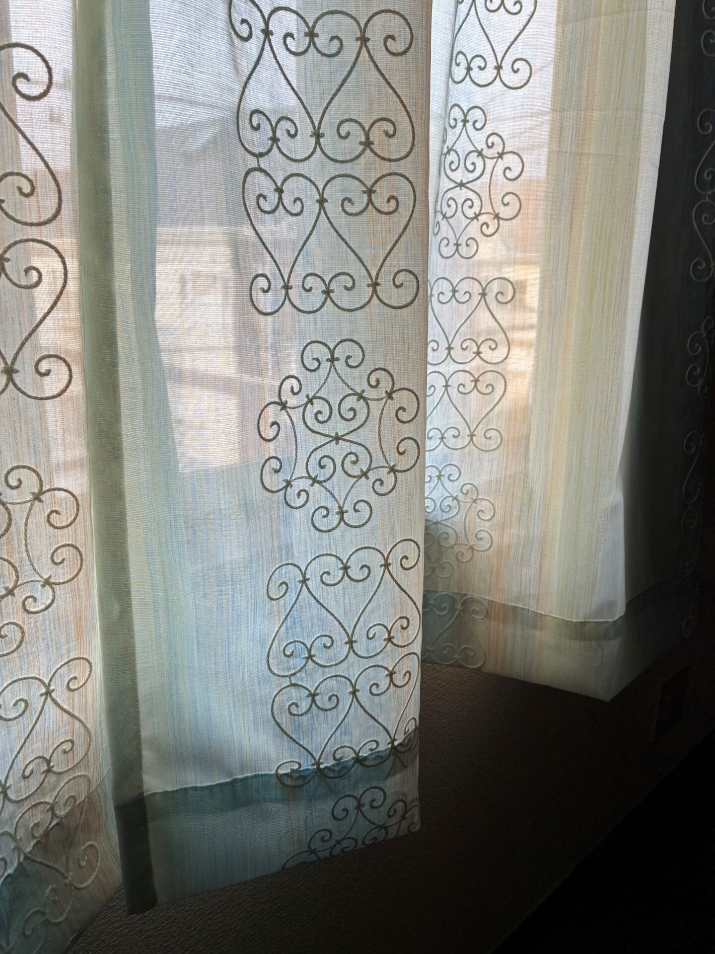 アラビアンなデザインの刺繍が施されているレースカーテンでございます。