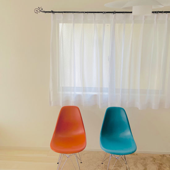 元々の家具がポップなカラーの物をご使用の箇所にはシンプルなレースカーテンを、