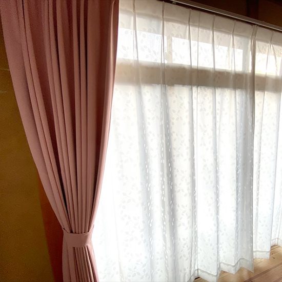 レースのカーテンのリーフ柄はとても素敵で中からは明るいのですが外からは全く見えません。遮光カーテンもしっかりした生地でダグラスピンクがとても落ち着いたピンクで外へ光も漏れず大満足です。