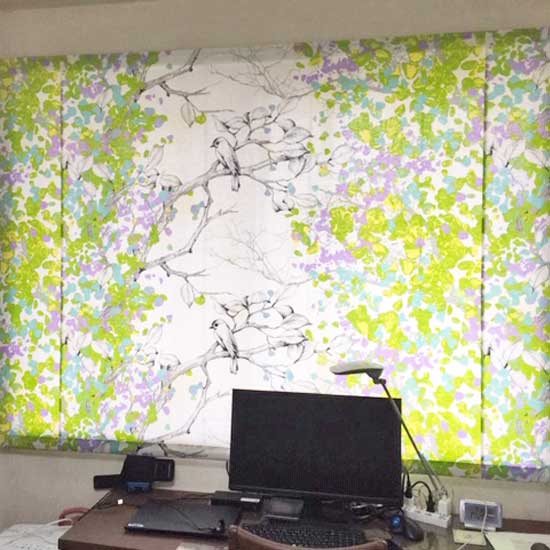 「絵のように飾りたい」といただいていたご希望を叶えるべく、お客様との打ち合わせ後は実際の生地にメジャーを当てながら、工場スタッフと鳥の位置について打ち合わせを重ね、完成したシェードです。