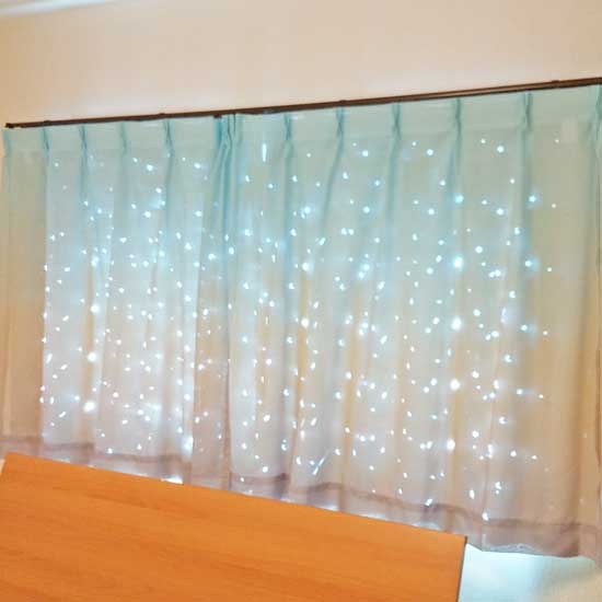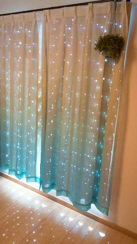 シャインスターズアイボリーの切り抜き部分からの光が虹色のように見え、レースカーテンに反射した光がまたすごく綺麗です。