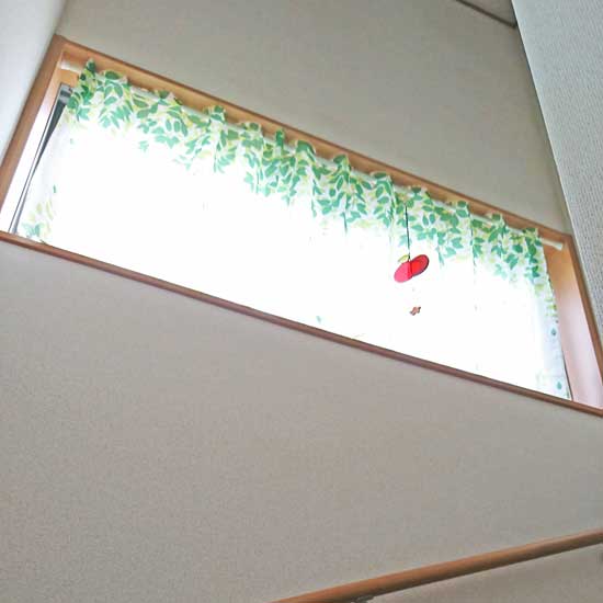 グリーンの葉がデザインされた綺麗なカフェカーテン