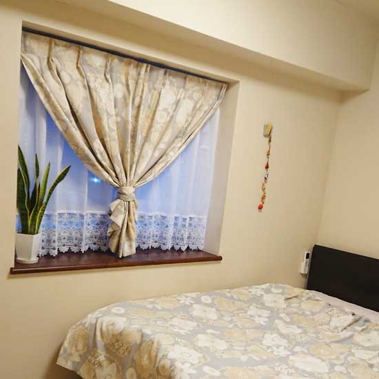 窓の方は、片開きカーテンで合わせ目を作らず、すっきりとしています。