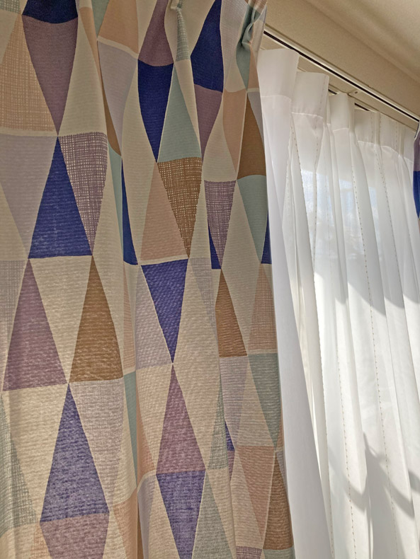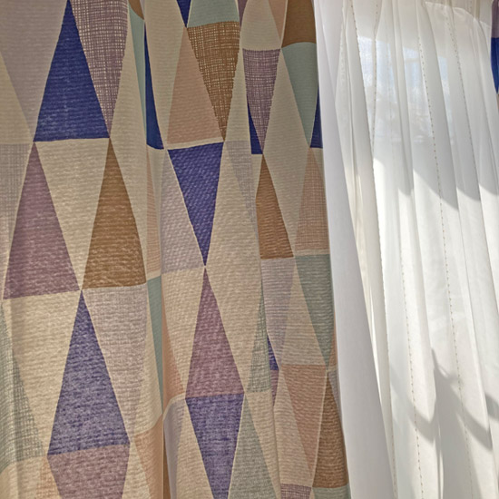 優しいタッチで三角形の幾何学模様が描かれた北欧デザインカーテンです