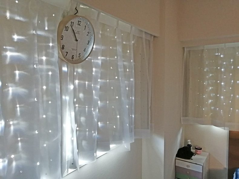 一枚目のカーテンは星や月の形がくり抜かれており、内側の白いカーテンに光が反射してキラキラと輝いており、