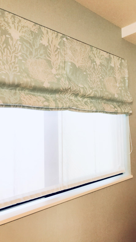 リビングの腰高窓に掃き出し窓のカーテンと同じマリンシリーズの生地でダブルのシェードをつけました。