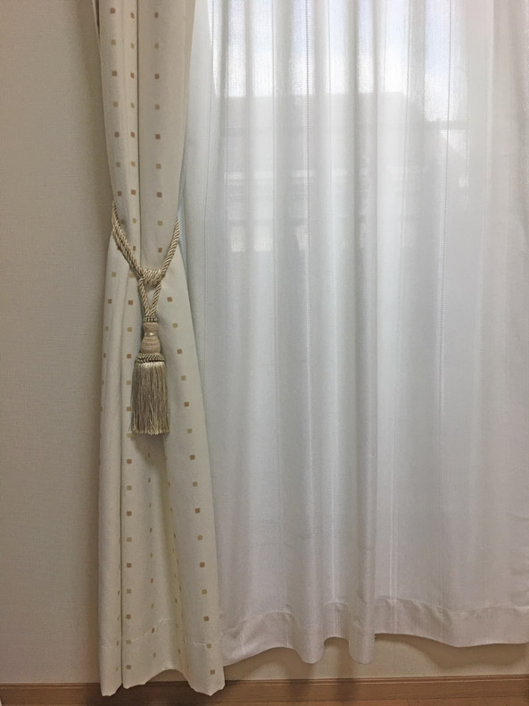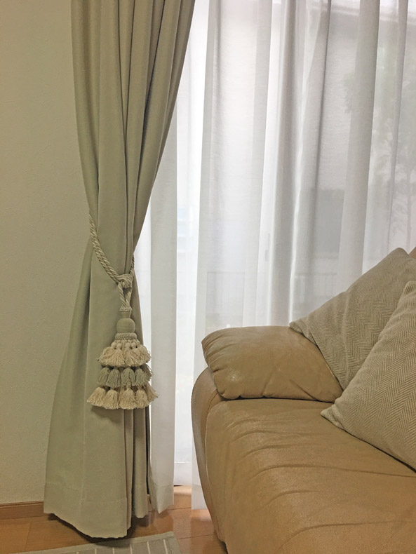 同じリビングの厚地カーテンは元々あったものにタッセルを購入しましたが、ネットでは色味が合うのか不安だ