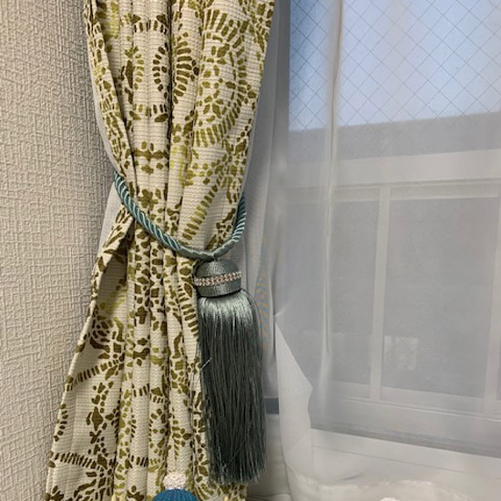 カーテンのグリーンとタッセルのブルーの組み合わせがとても素敵です( *´艸`)