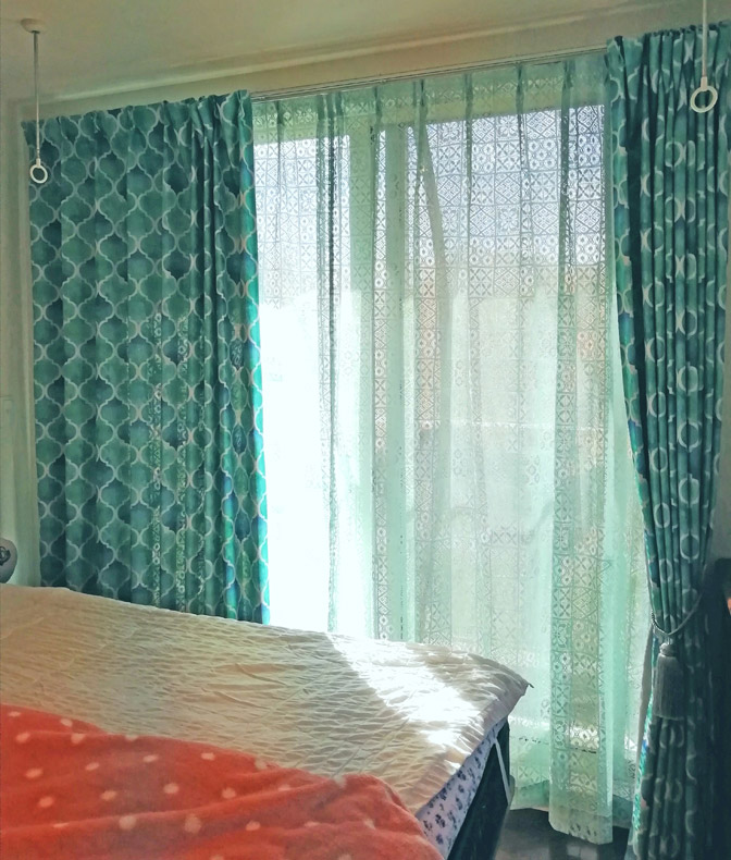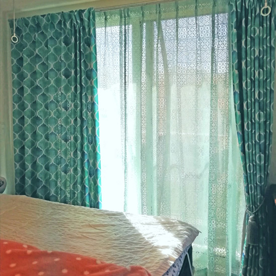 以前はダークブラウンの、重量のある遮光カーテンでしたので違いに驚きです。