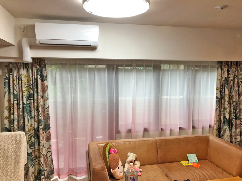 今回掃き出し窓にお選びいただきましたドレープカーテンの<アマゾニア ピンク>は大胆なデザインで大変インパクトがあるカーテンなのですが、