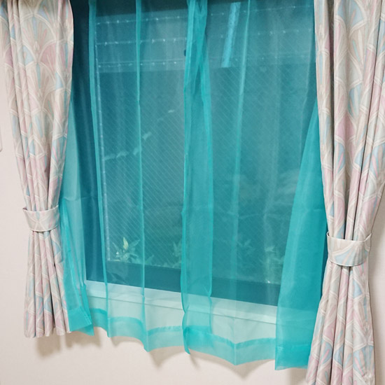 レースカーテンは<レースオーラ ブルー>をチョイスしていただき、こちら綺麗なブルーが目を引く大変人気のカーテンでございます。