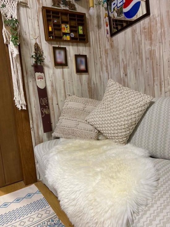 壁の色調、オシャレなソファーと小物とそしてご購入頂きましたムートンラグがアクセントになって