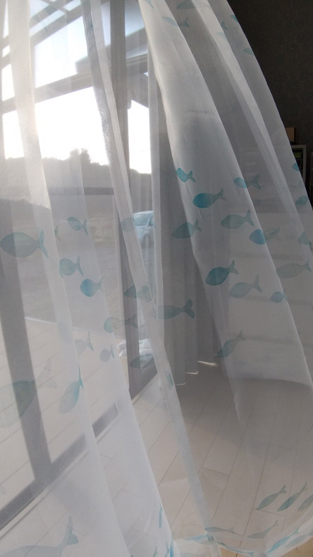 オーガンジーに水彩タッチのお魚がおしゃれなレースカーテンとなり、