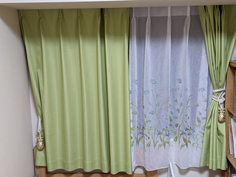 自分の好みにぴたりな緑色の遮光カーテンが見つかり、それに合うレースカーテンでアドバイスをいただいたお花の刺繍のレースを選びました。