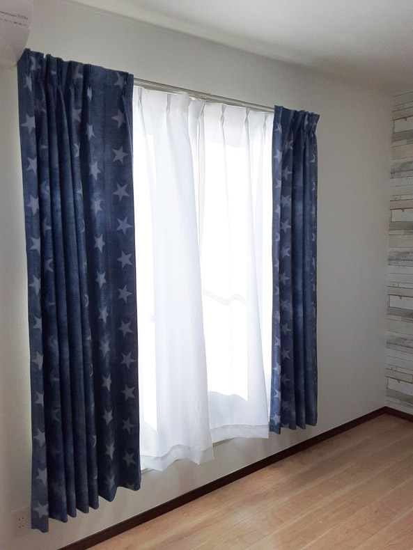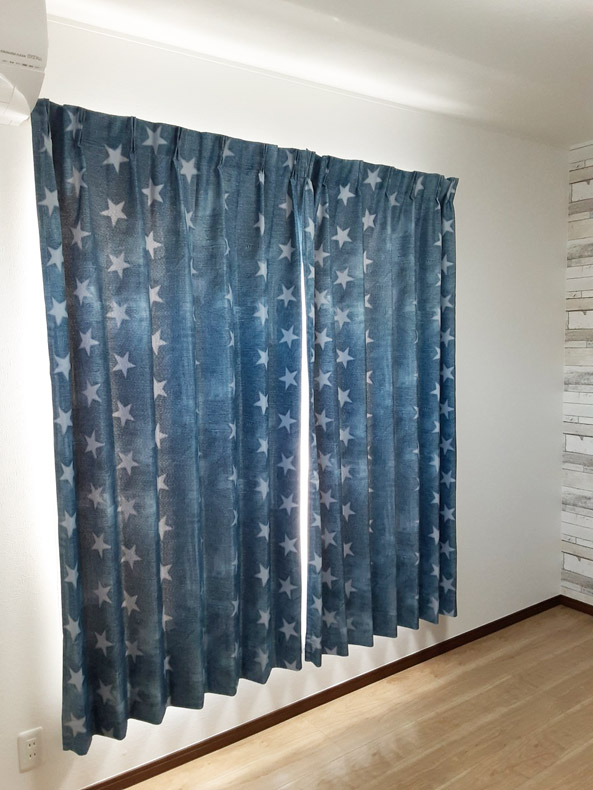 <estrella エストレラ – ブルー>はデニムのような素材感の生地に星柄をデザインされた2級遮光カーテンです。