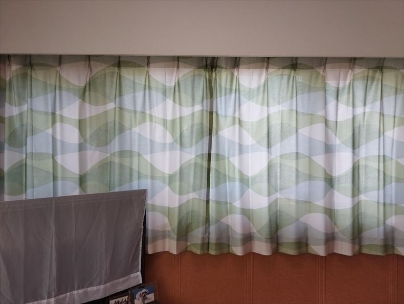 今回お選びをいただきました<Welle – ヴェレ グリーン>は斬新な色合いの模様がとってもおしゃれな非遮光カーテンとなっております。