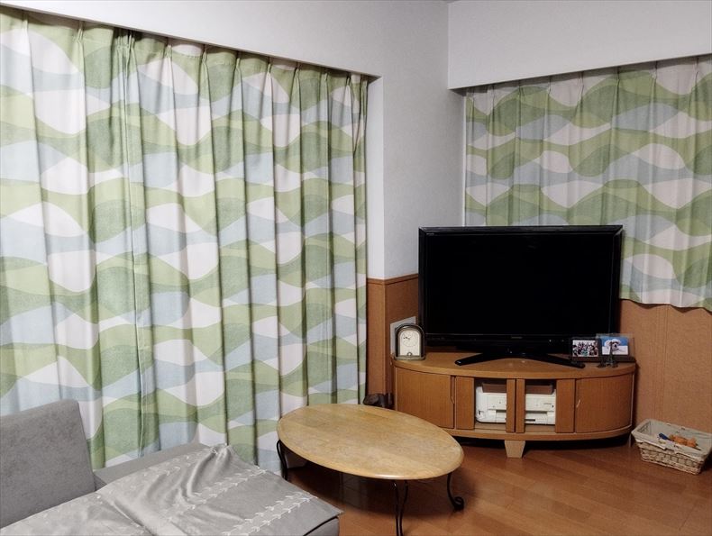 南西角リビングの二面のカーテンを探していて、当初は部屋を広く見せる為、