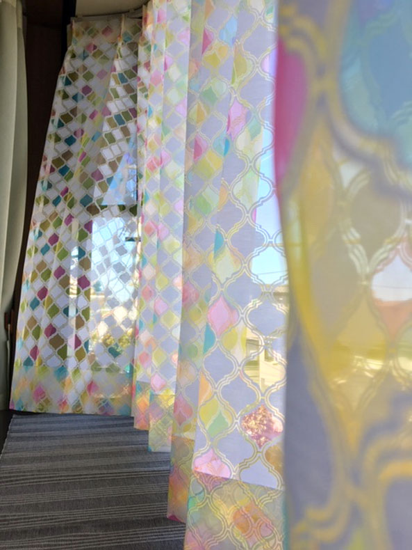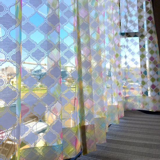 カラフルなオパールプリントとデザインが印象的なレースカーテン。
