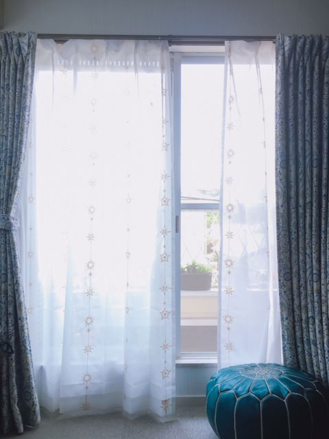 実は去年モロッコ(タンジェ、シャフシャウエン、フェズ のみですが)に旅行に行き、モロッコ 雑貨にハマっていて、カーテンもモロッコ風にしたいなと思ったところからびっくりカーテン様に出会いました。