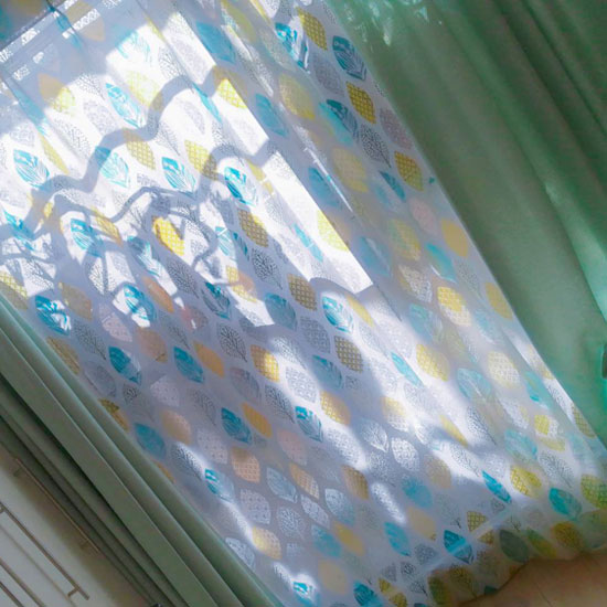 非遮光の<ミニエトッフ>は優しく光を取り込むので、陽ざしを受けると<リーフオーナメント ライトブルー>のオパールプリントも一層映えるかと思います。