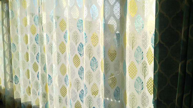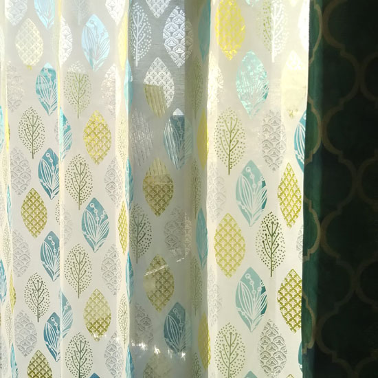 <リーフオーナメント ライトブルー>は光を取り込むオパールプリントがポイントの大人気のレースカーテンです。