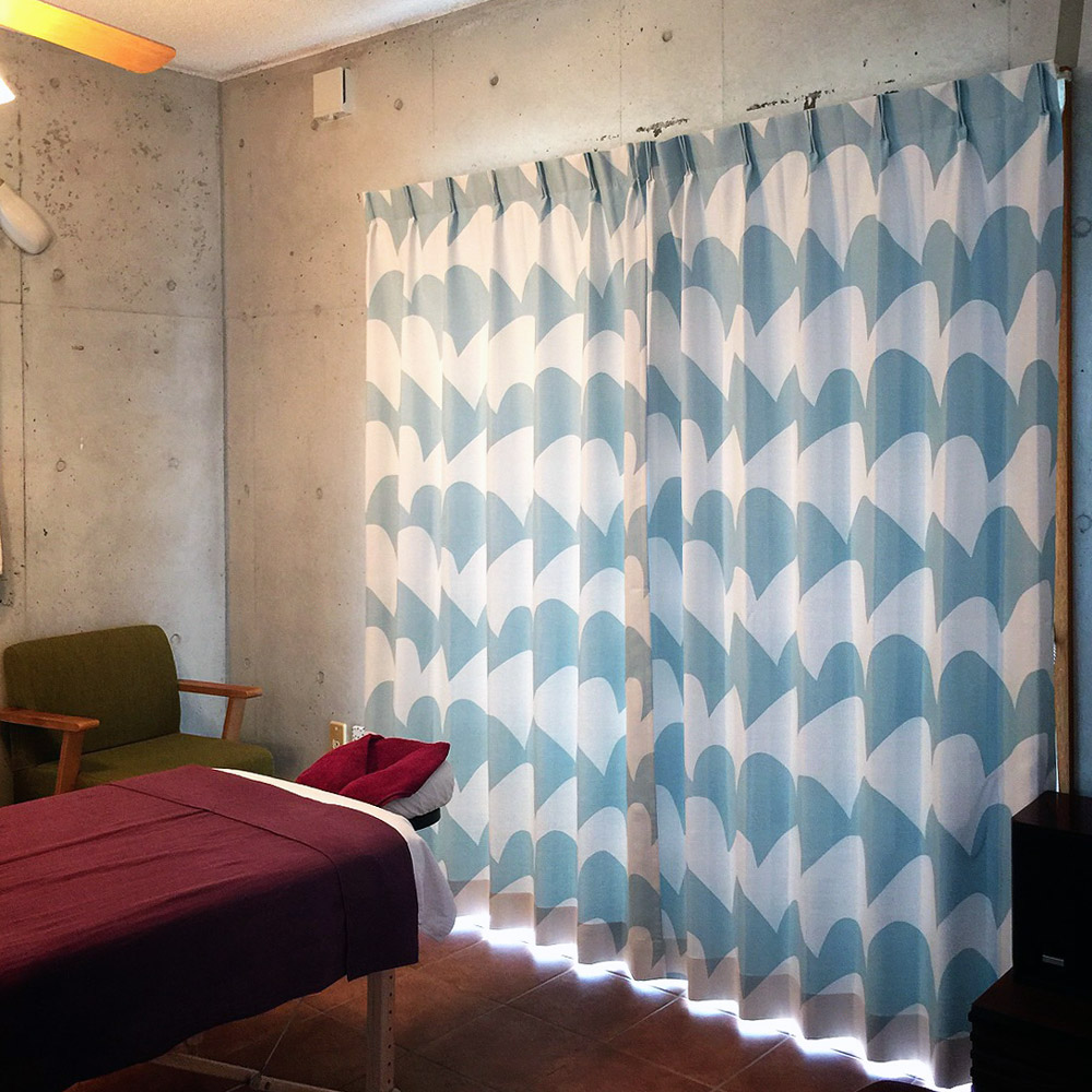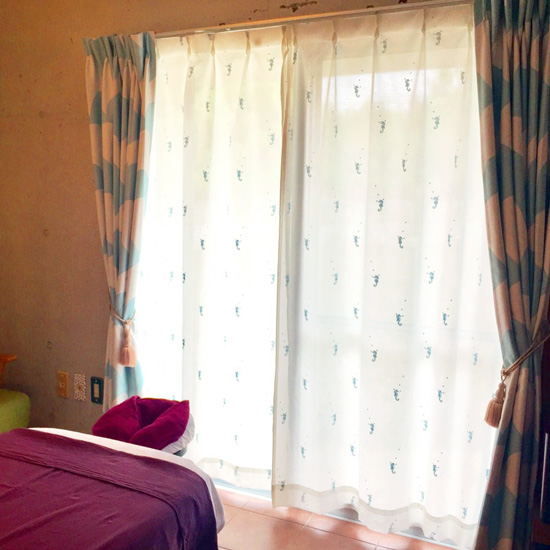 爽やかなブルーのなみなみ模様と、レースカーテンに入った可愛いオトシゴが、素敵にマッチしていますね♪