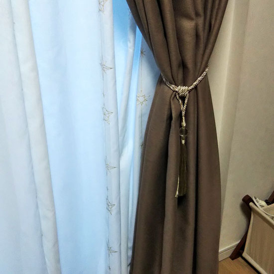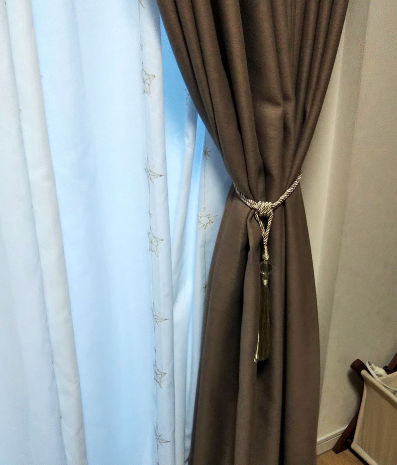 落ち着いたダークブラウンのカーテンに、キラキラタッセルがとてもいいアクセントですね!
