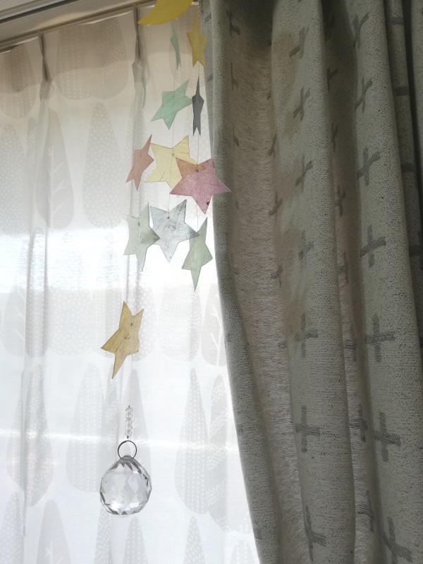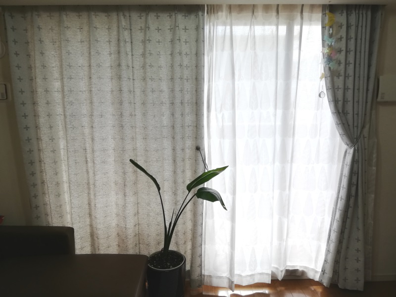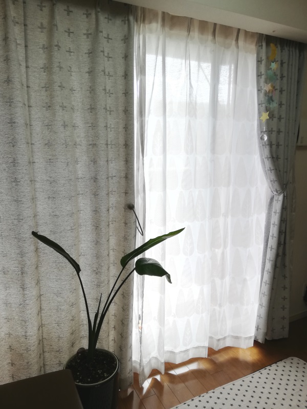 カーテンは厚手でほっこりとした素材感なので、柄のシャープさが少し緩和されるような気がします。