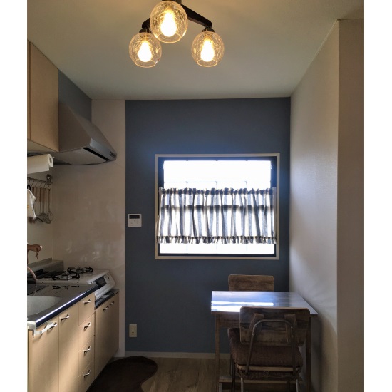キッチンの方のお写真は<port frill- ポート フリル>のカフェカーテンをお使いいただき、こちらは可愛らしいカフェカーテンをカジュアルガラな柄で合わせられている事で、