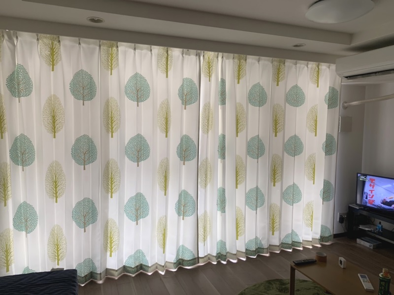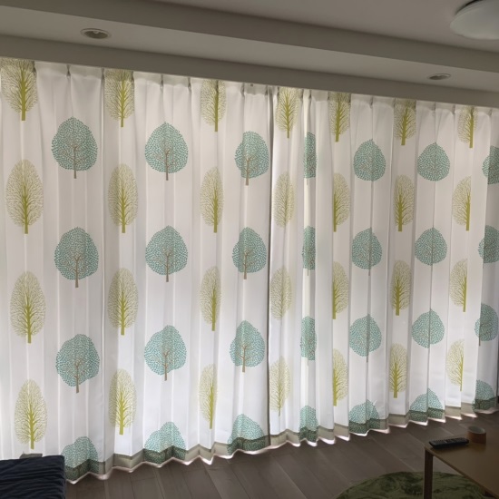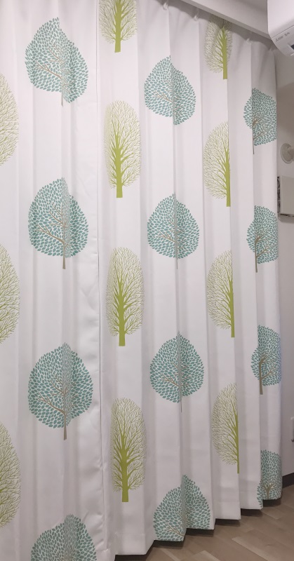 イエローグリーンとグリーンの木がお行儀よく並んだ可愛らしいカーテンです(*´ω`)