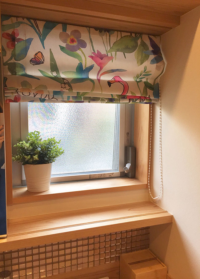 まず洗面所は曇りガラスなのですが、電気をつけるとうっすらと体のシルエットがわかることからシェードを取付けることにしました。