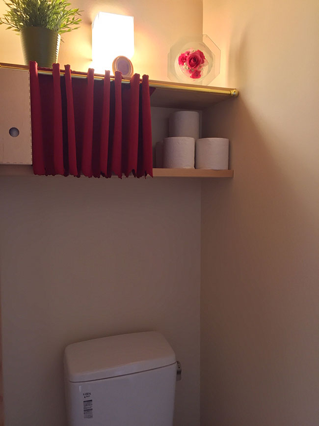 こちらはトイレの棚の目隠しに、二階のトイレなので簡単にと思い突っ張り棒でカフェカーテンを取り付けまし