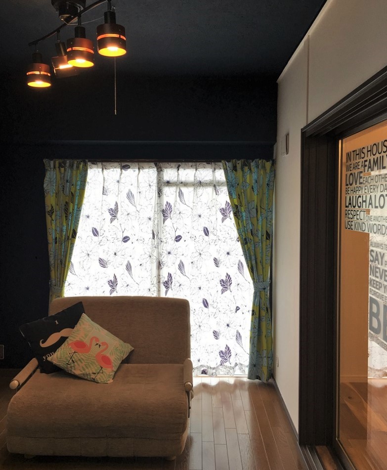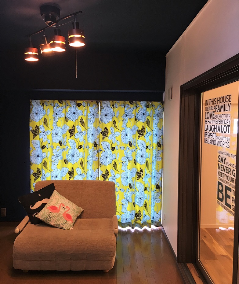<アンムール イエロー>は大胆な柄と明るいイエローで一見コーディネートも難しそうですが、お部屋のネイビーの壁とマッチしてイエローがより一層映えてステキです!
