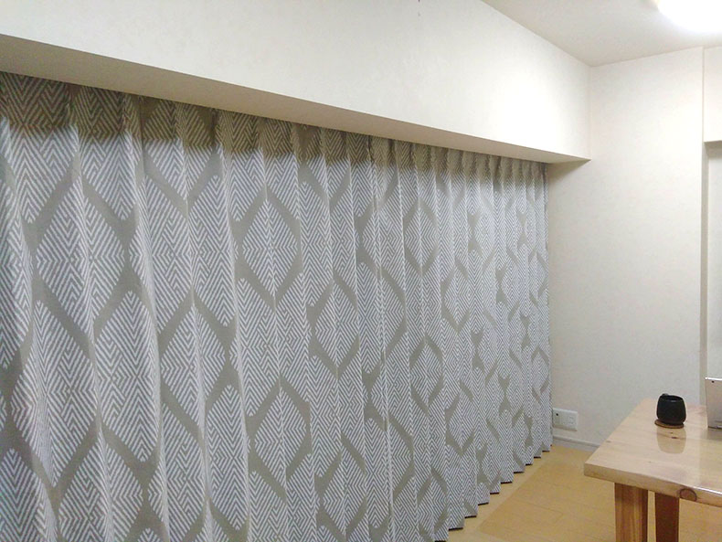 手書き風の幾何学デザインプリントが空間の絶妙なアクセントとなって