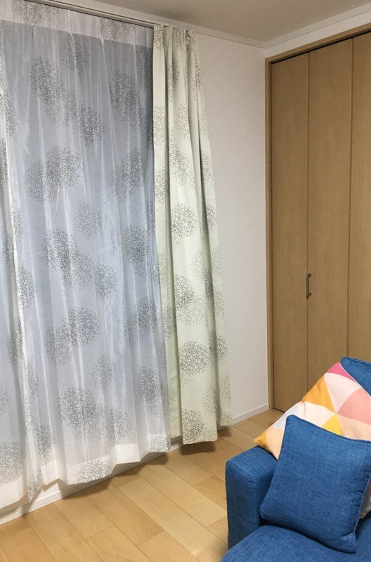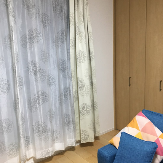 一緒に写っているソファーと、幾何学模様のポップなカラーのクッションがカーテンと合った北欧なイメージですね(#^^#)
