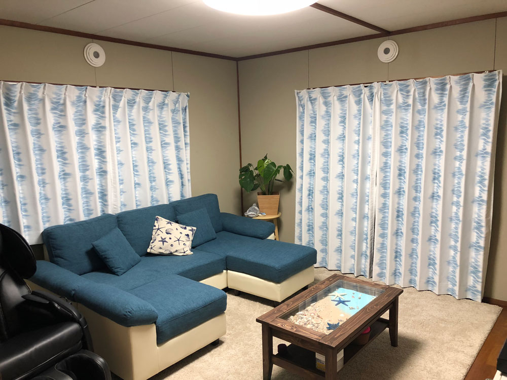 遮光カーテン< MARINE & PIER ・リプル シーブルー>は白が基調なので、