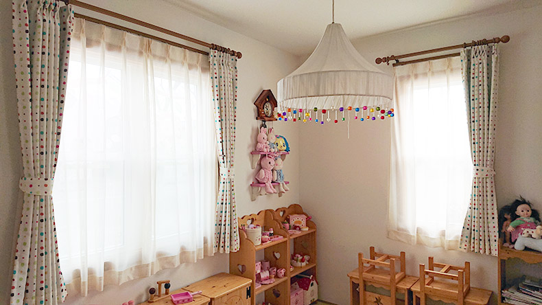 カーテンのドットのデザインと照明の飾りと統一感もありますし