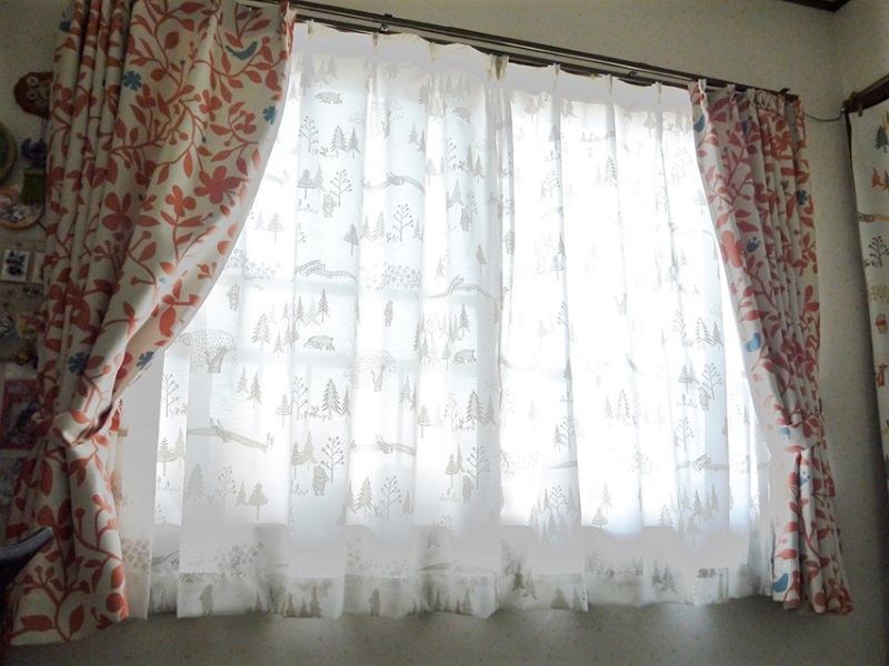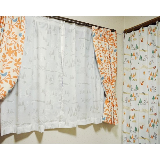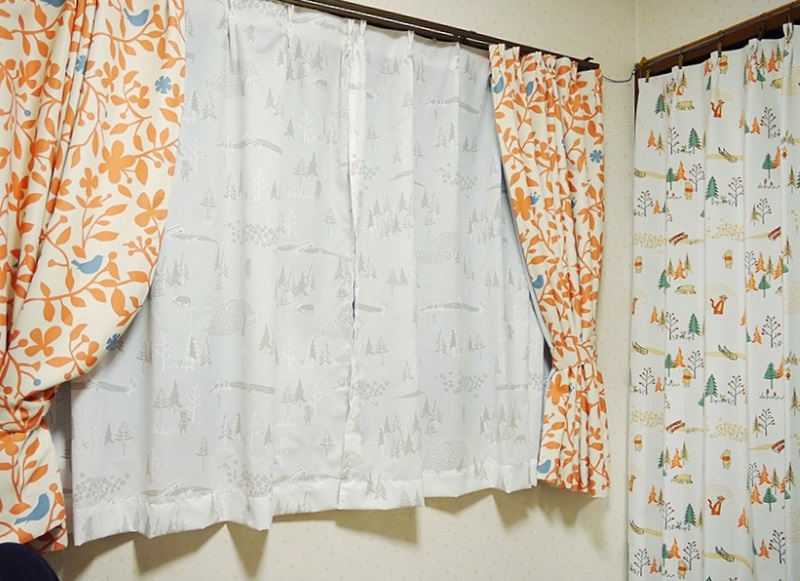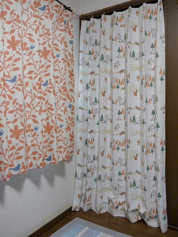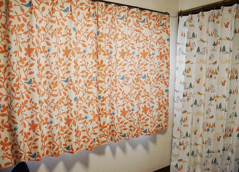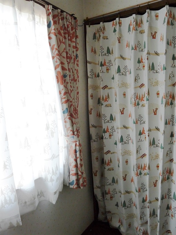 決めかねてサンプルを取り寄せて、オレンジの葉っぱと青い鳥デザインのカーテンとプーさん柄の実物を見てこちらの2つの柄にしました。