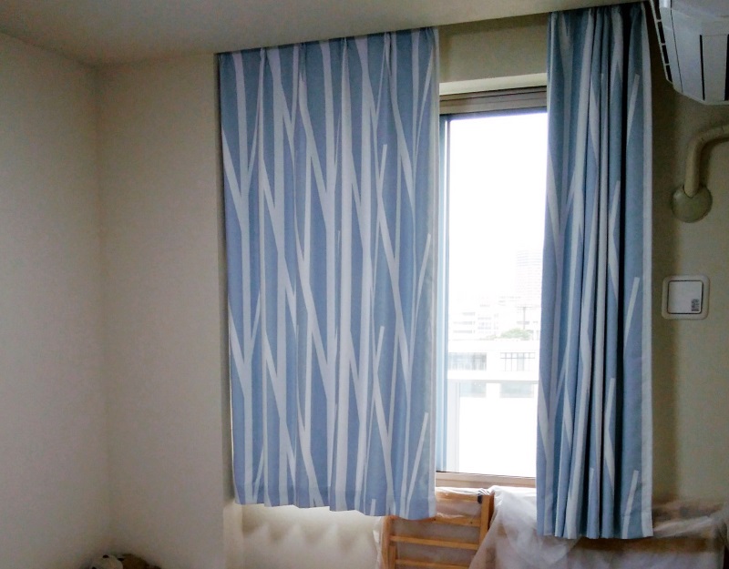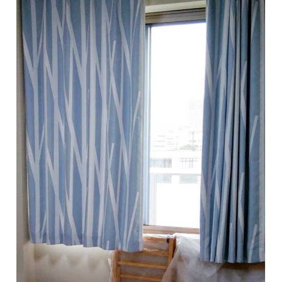 優しいブルーのベースに北欧風にデザインされた樹の幹のようなかわいい柄が入ったカーテンです!