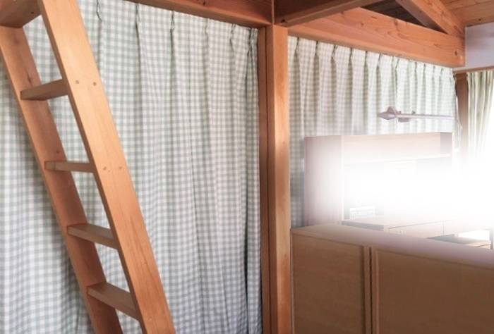 ロフトでもほかの部屋から漏れる光を通さないことが第一優先でしたので、あえてカーテンは長めに垂らしています。