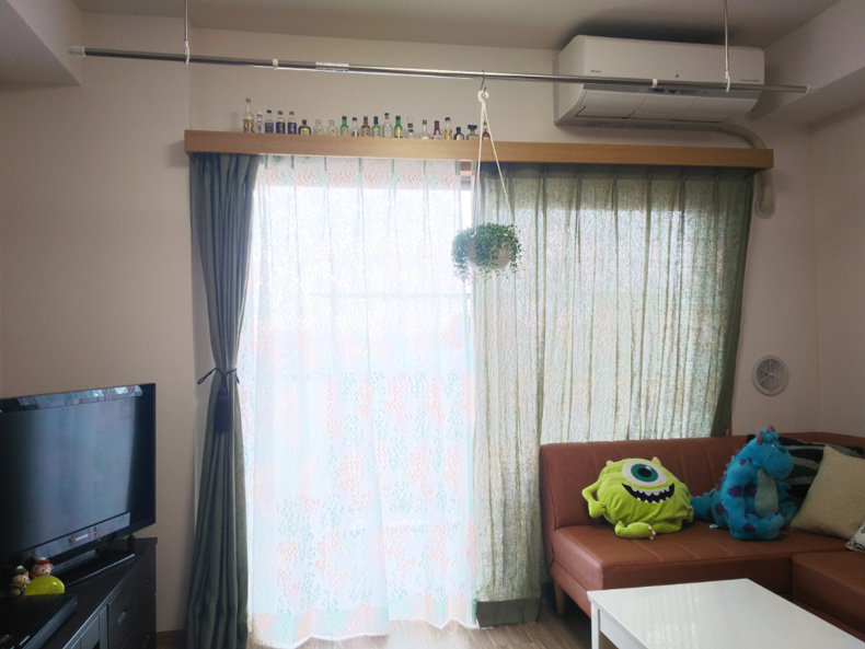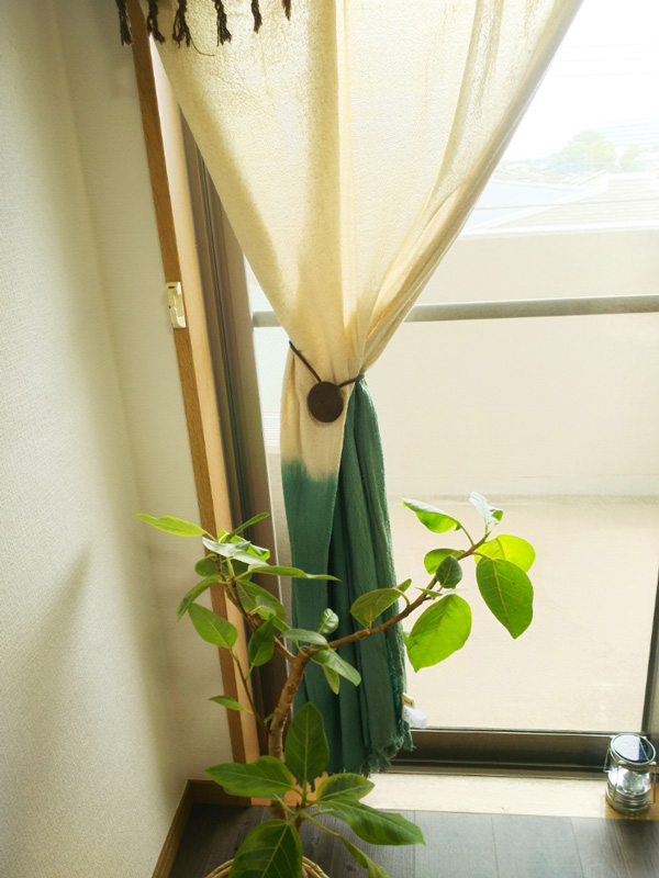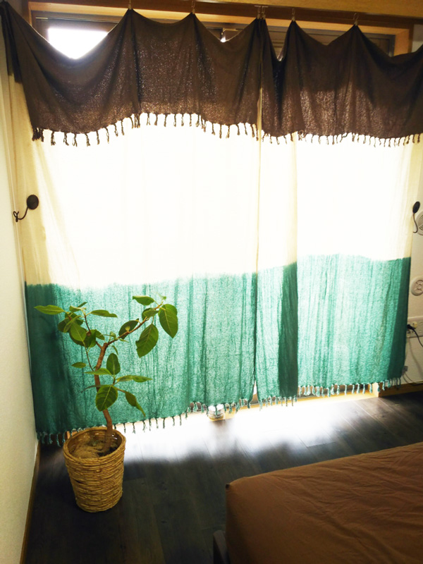 また、もうひとつのトロピカルカーテンは寝室ですが、こちらはアレンジ自在にいろいろスタイルを変えられるので良いです。
