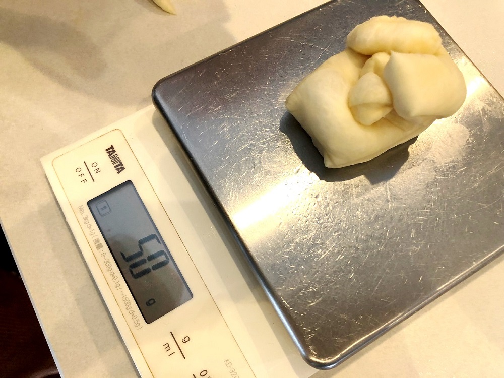 まずは、既に奥様がご準備いただいていた生地を、それぞれ50gに切り分けていく作業からです。今回お邪魔した4人。パン好きというだけでなく、負けず嫌いという点においても抜きに出た4人です。