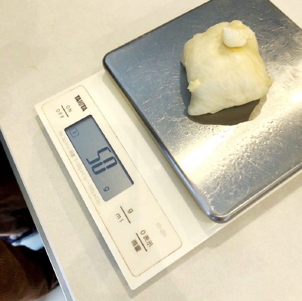 なかなか50gにならず、クズクズを積み上げてしまう面々。ついむきになって無言で切り分け続けます。3度の調整までで指定の重量に切り分けられることがパン講師になるための試験の基準だそうで、できるだけ少ない回数で切り分けられるようにみんな必死です(笑)