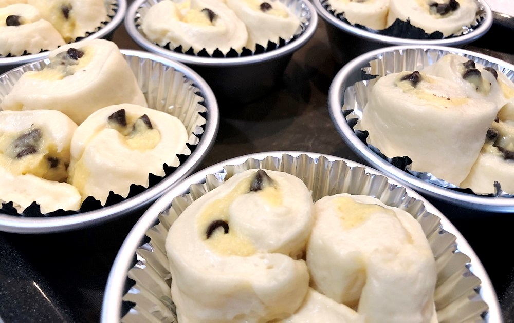 膨らんだ生地を台の上で一度叩いて空気を抜いて伸ばしてから、カスタードを伸ばし塗り、チョコチップを振りかけてロール状に巻いていきます。