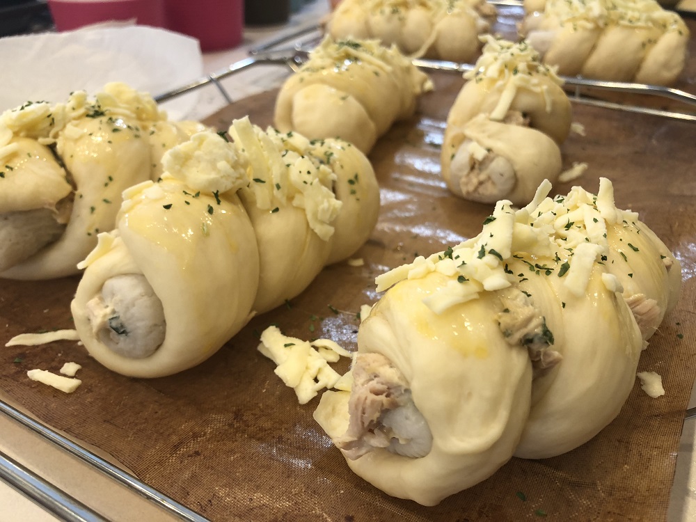 次に、こちらも奥様が予め、ちくわにツナと しそ を和えたものを詰めた状態までご準備いただいていたものに、パン生地を巻き付けていく作業です。