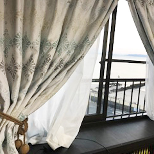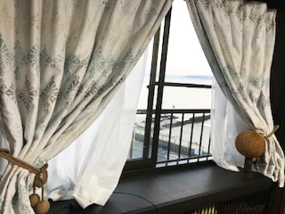 お写真ではカーテンの柄も海も両方楽しめるよう、カーテンを緩く開けてくださってますね!